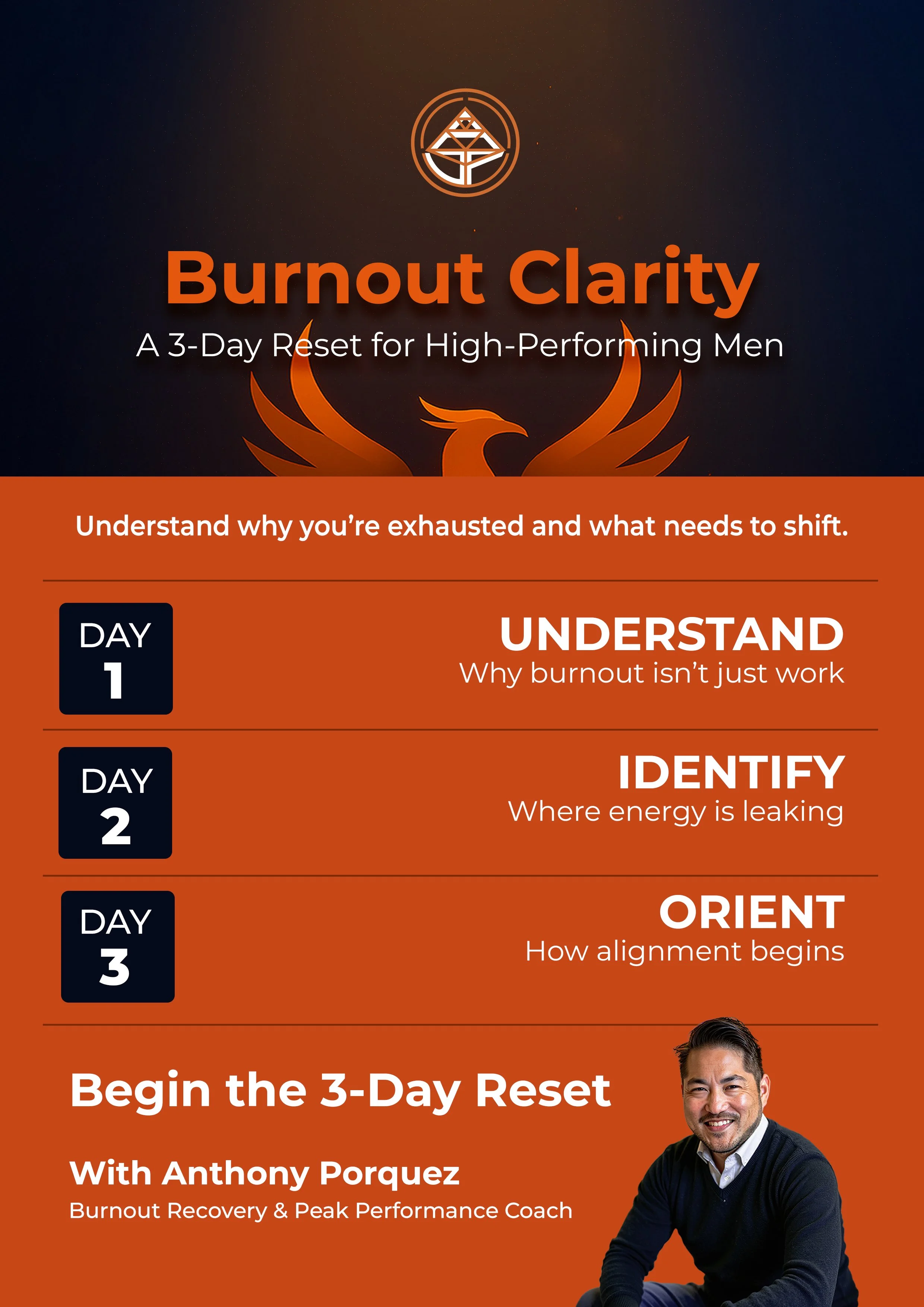 BURNOUT CLARITY is a short, guided FREE 3-day reset designed for men who operate at a high level — and are ready to protect the one thing that actually sustains performance: Energy.