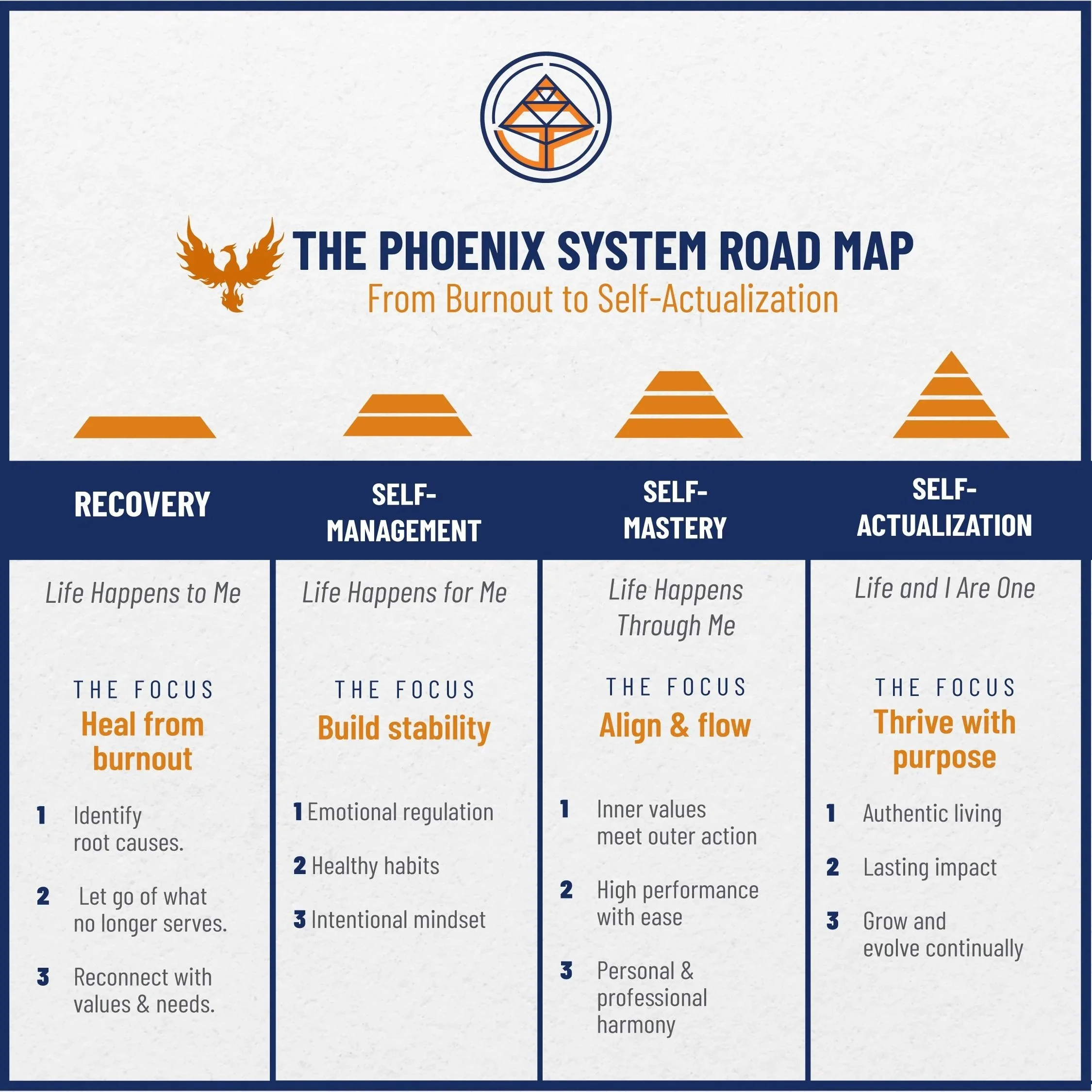 The Phoenix System is a four-phase framework designed to help you restore alignment across your body, mind, identity, and environment — so performance becomes sustainable again.